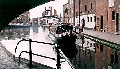 Gas street basin with narrow boat from under Broad Street bridge