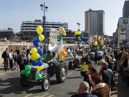 Description: Tractors on Paradise Hill decked out as floats in St Patrick's Day parade