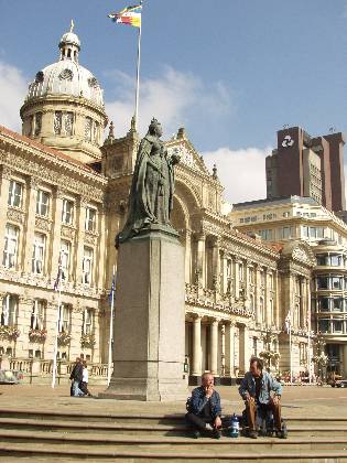 Queen Victoria statue, people on steps Welsh flag flying on Council House