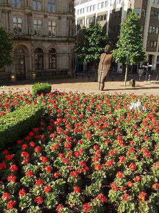 Description: Iron man statue in environment of flower beds
