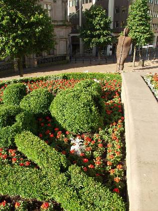 Iron man statue in environment of flower beds