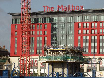 Mailbox building view through foreground of Orion construction with cranes