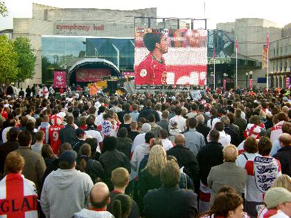 Euro 2004 England supporters in Centenary Square watching giant screen
